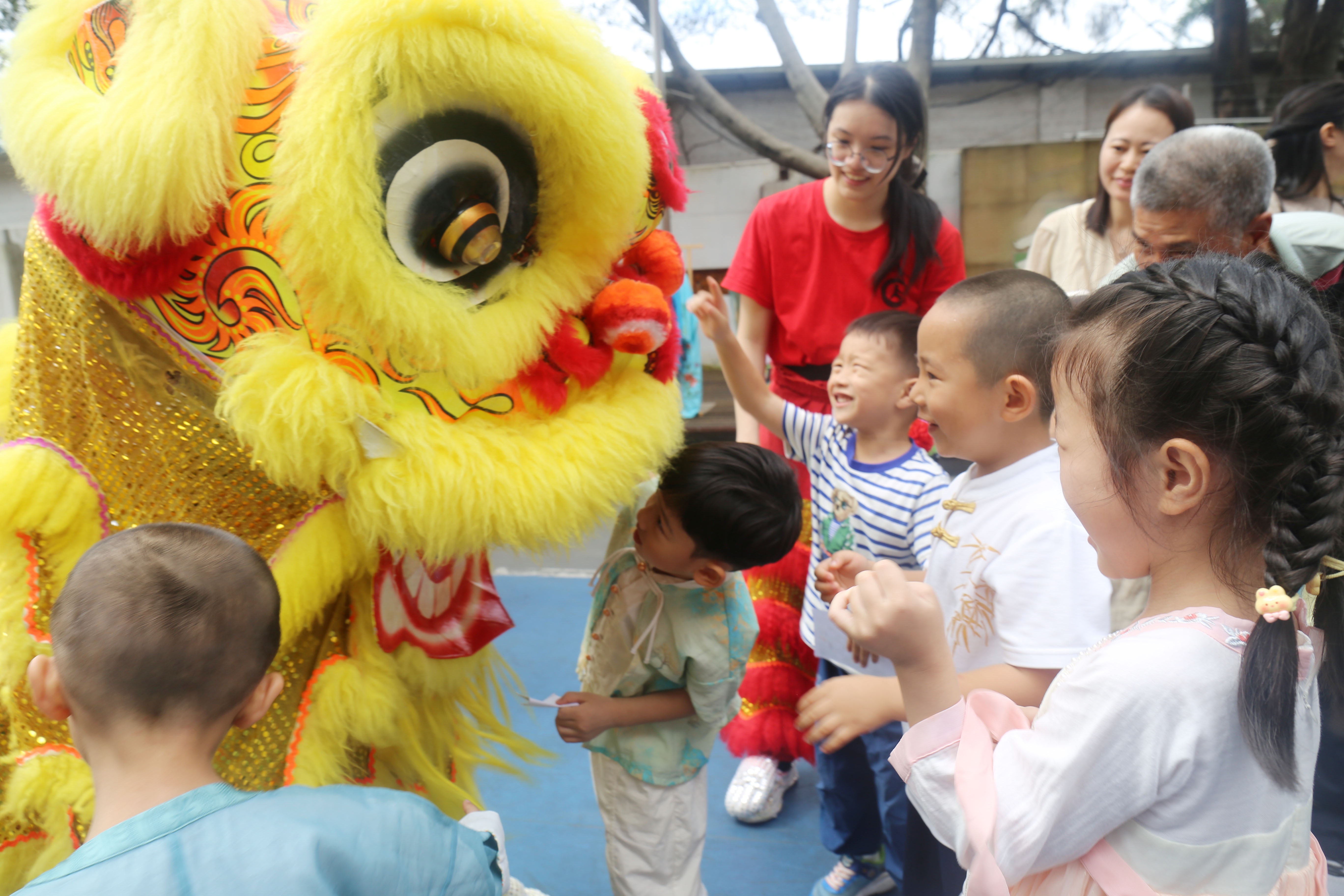 与醒狮互动。